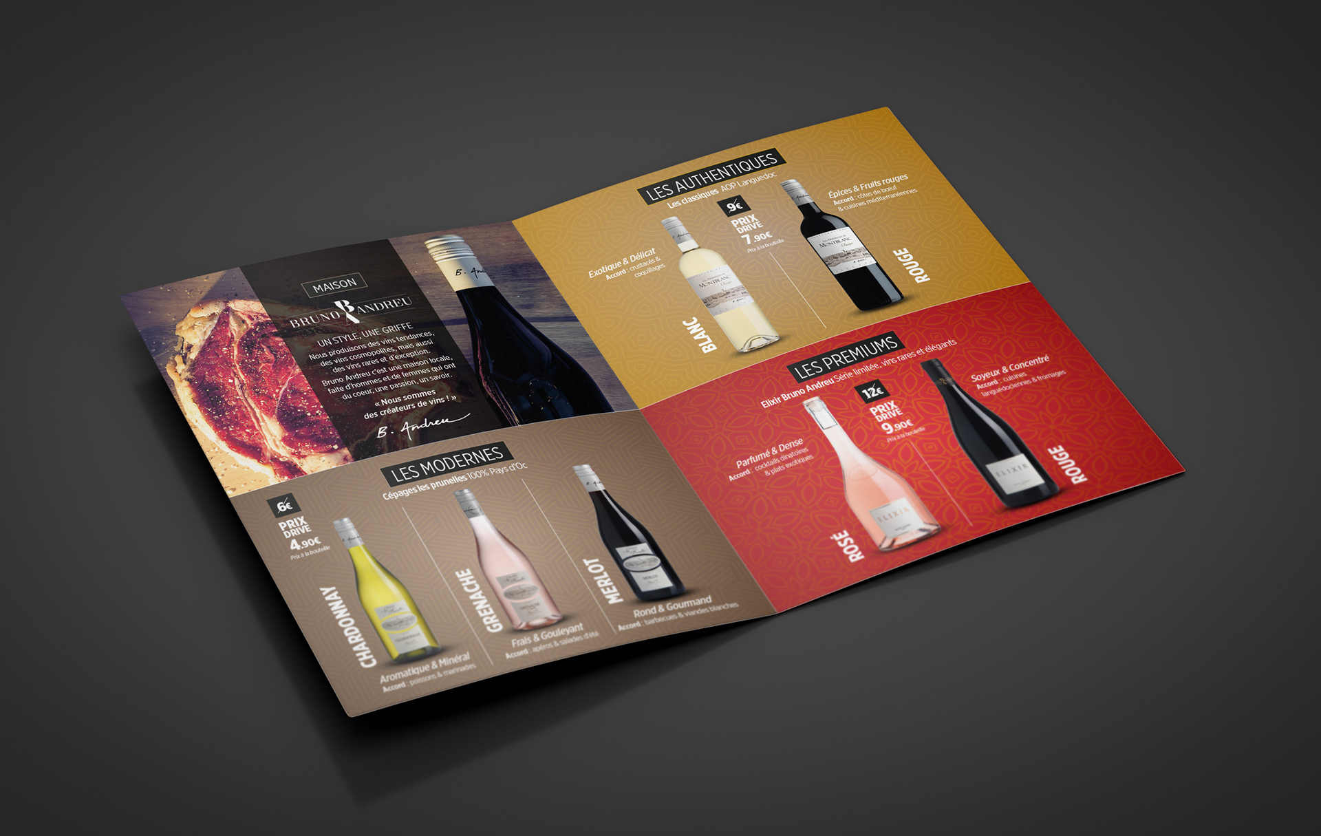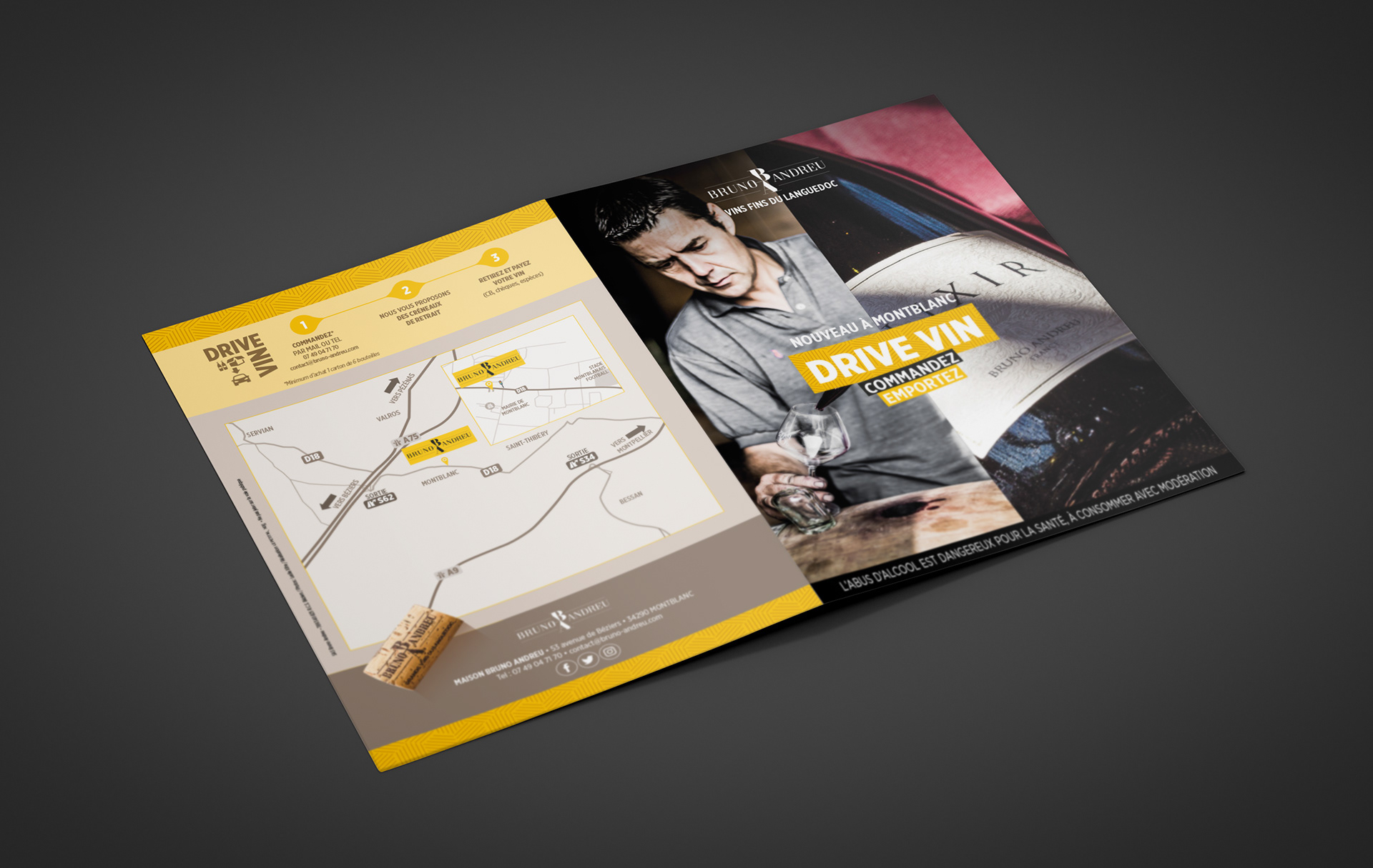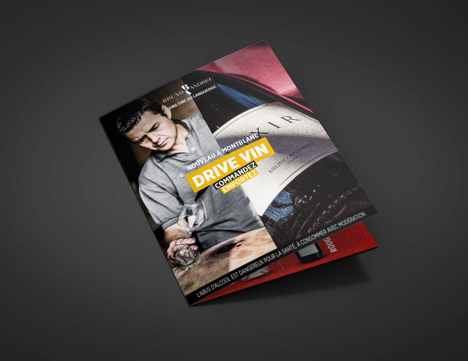 Direction artistique flyer A5 4 pages pour le lancement du DRIVE VIN du Domaine Bruno Andreu. Réalisé pour le compte de l'agence Le Petit Monde