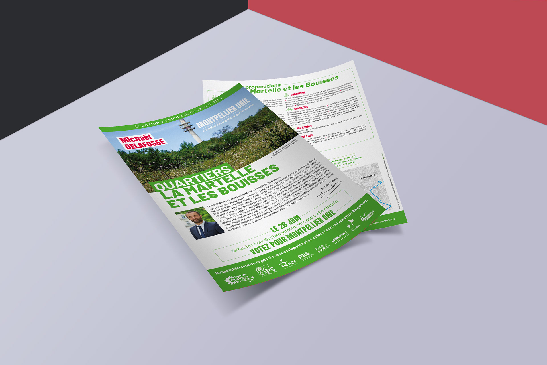 Création, propositions, présentation et mises en situation de pistes créatives des outils de communication de Campagne Municipales 2020 Michaël Delafosse "Montpellier Unie" : Identité visuelle Montpellier Unie / Affiche de campagne / Bulletin de vote RoVo / Circulaire A4 RoVo / Rollup / Panneau Montpellier Unie A0 / Programme A4 4 pages / Lettre A4 Senior RoVo / Tract de quartier A4 RoVo Les Aubes / Retouche photo et chromie, / Cover & banners Facebook, Twitter, Linkedin, banner animée mp4 (Instagram) et gif animé (Twitter) / Visuels pour outils web et RS. Réalisé pour la compte de l'agence Suncha.