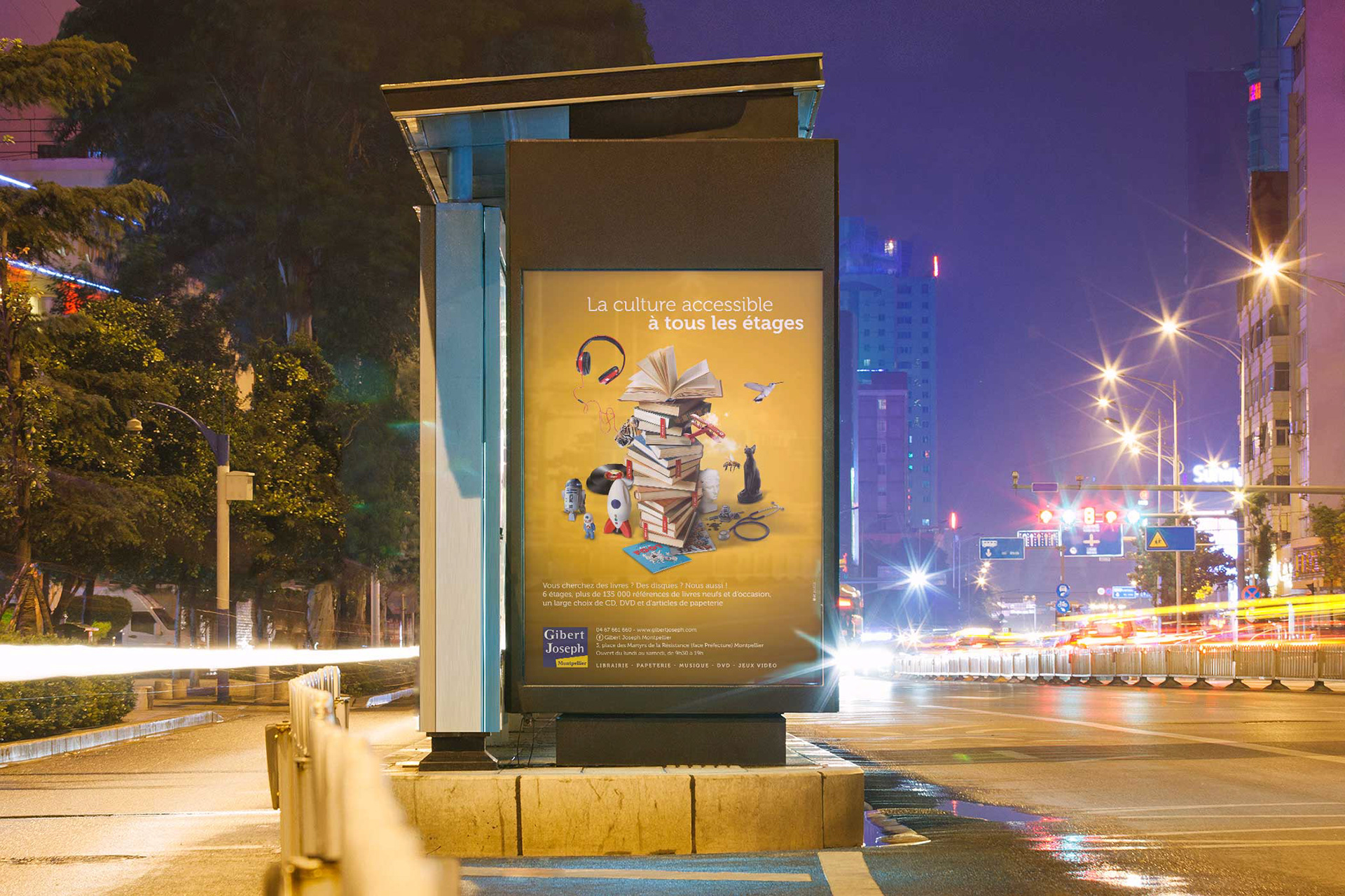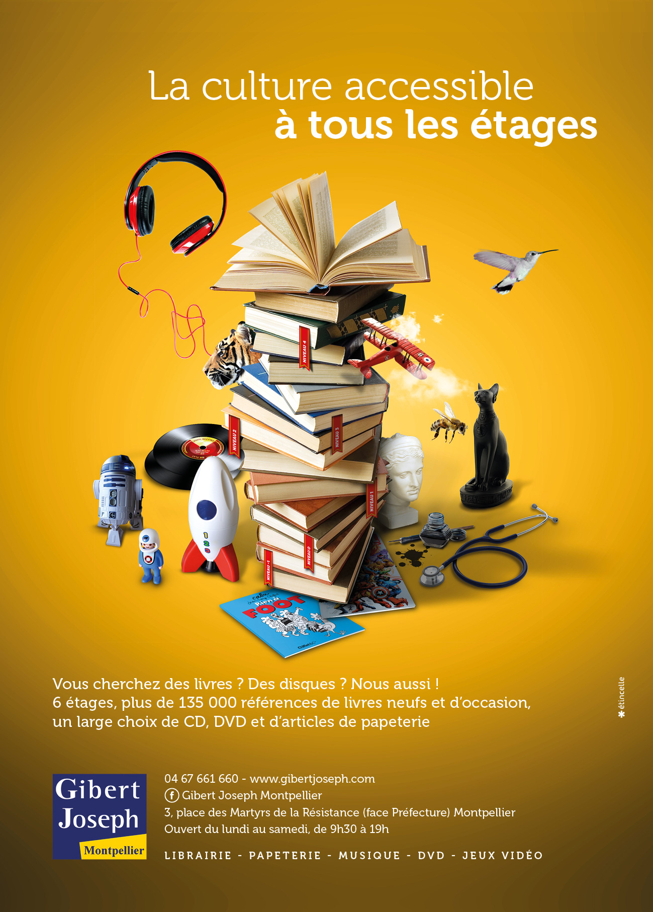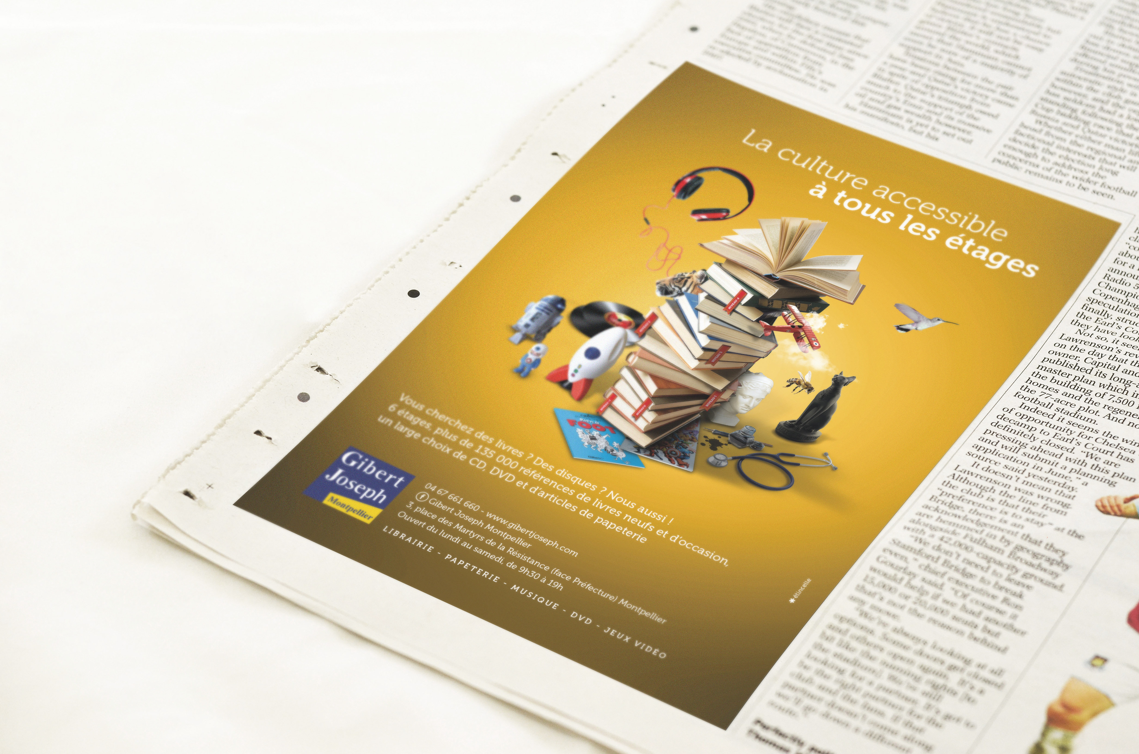 Direction artistique, photo compositing, retouche photo et rédaction de la nouvelle campagne de communication de l'enseigne Gibert Joseph Montpellier.