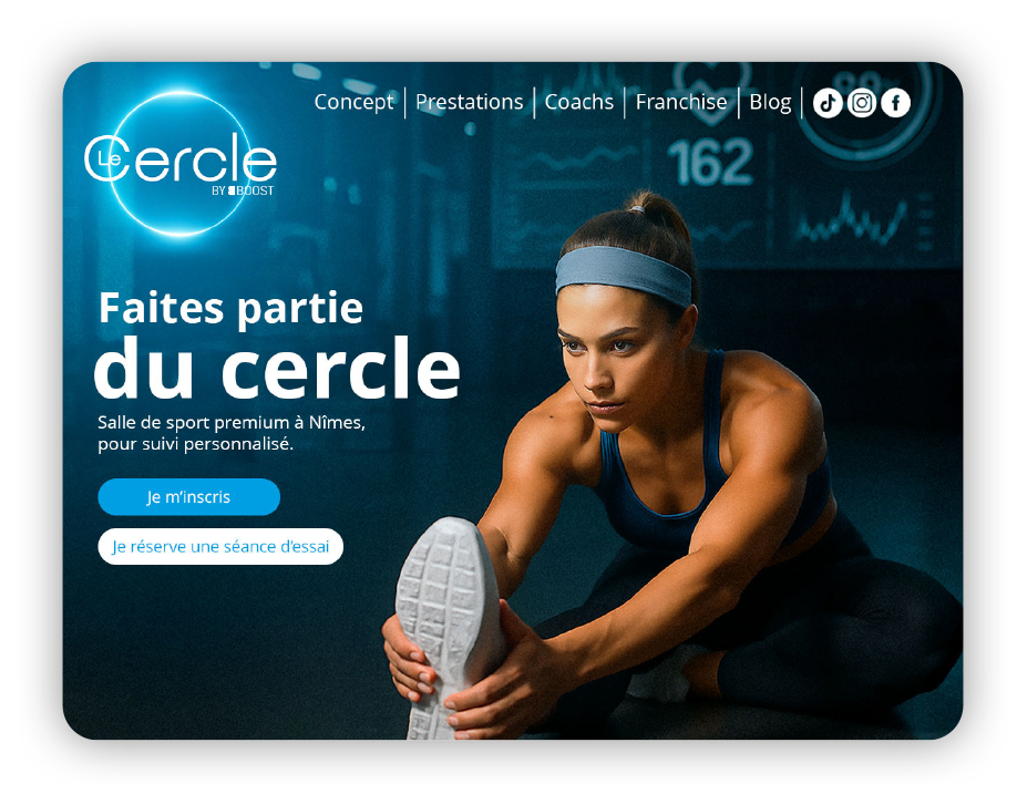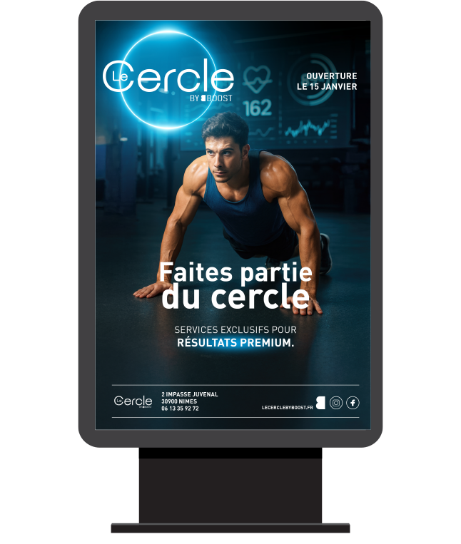 Le Cercle by BOOST est un nouvel espace premium dédié à la performance et au bien-être, pensé pour une communauté d’hommes et de femmes en quête d’équilibre, de motivation et d’accompagnement personnalisé. Environnement haut de gamme, technologique (écrans digitaux, contrôle rythme cardiaque) et inclusif. Porté par des valeurs fortes comme la bienveillance, l’expertise, le progrès, l’excellence et le respect. Direction artistique, refonte du logo, proposition créative de campagne d'affichage, de principe de Home page et de site responsive.